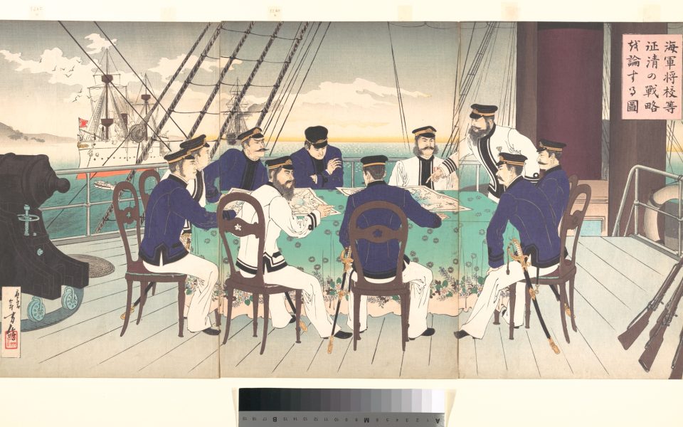 - From the Metropolitan Museum of Art‘s public-domain collection, tonight we’ve got a piece from the Sino-Japanese War: “Picture of Naval Officers Discussing Strategy to be Used in the War against China,” by Mizuno Toshikata, 1894.