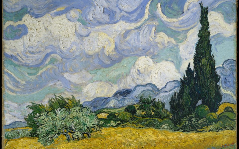 - Tonight’s featured image is “Wheat Fields with Cypresses,” a Van Gogh from 1889 that no doubt, looks much more spectacular in person. Taken from the Metropolitan Museum of Art’s public-domain collection.