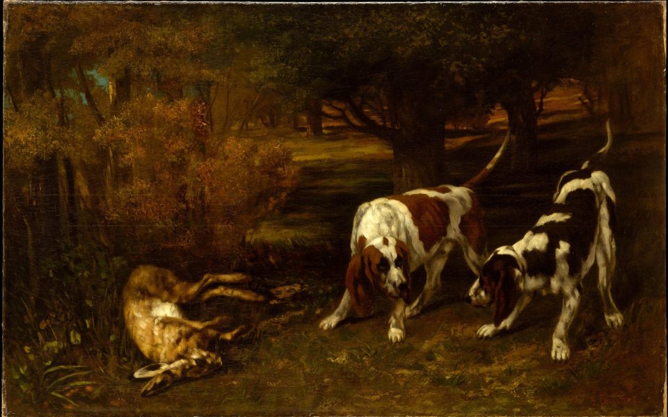 - From the Metropolitan Museum of Art‘s public-domain collection, tonight we’ve got “Hunting Dogs with Dead Hare,” by Gustave Courbet, 1857.