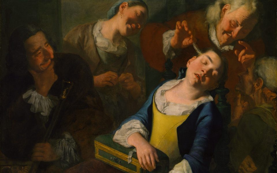 - For tonight’s featured image, we’ve got “Teasing a Sleeping Girl,” by Gaspare Traversi, around 1760. Why they teasing her?! Taken from the Metropolitan Museum of Art’s public-domain collection.