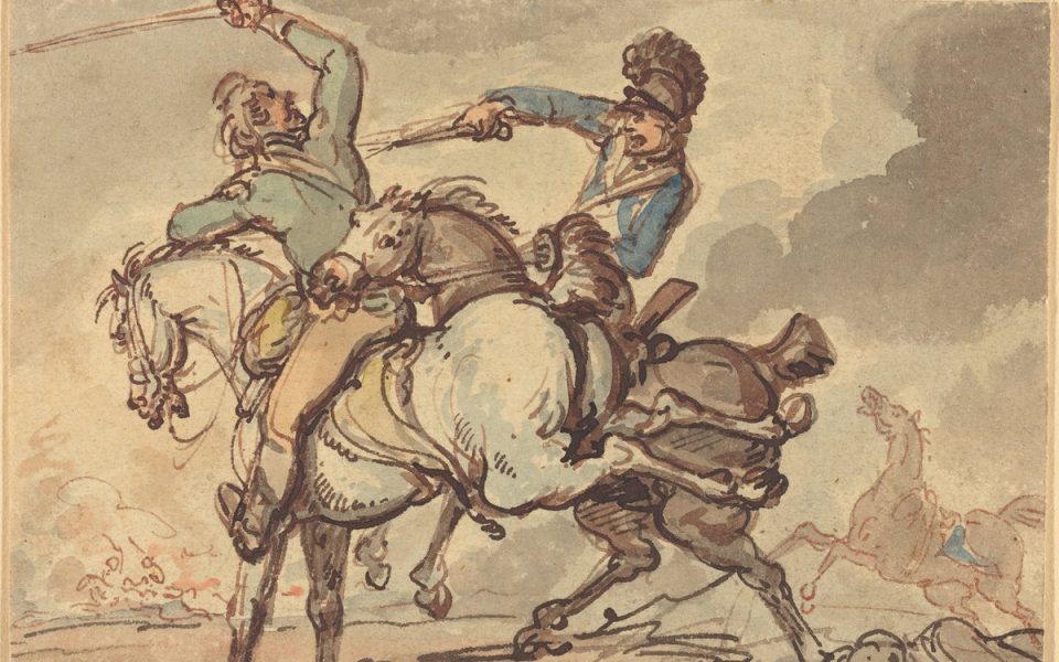 - Tonight’s featured image is “Cavalry Skirmish” by Thomas Rowlandson, undated. Thanks to the National Gallery of Art‘s public-domain collection.