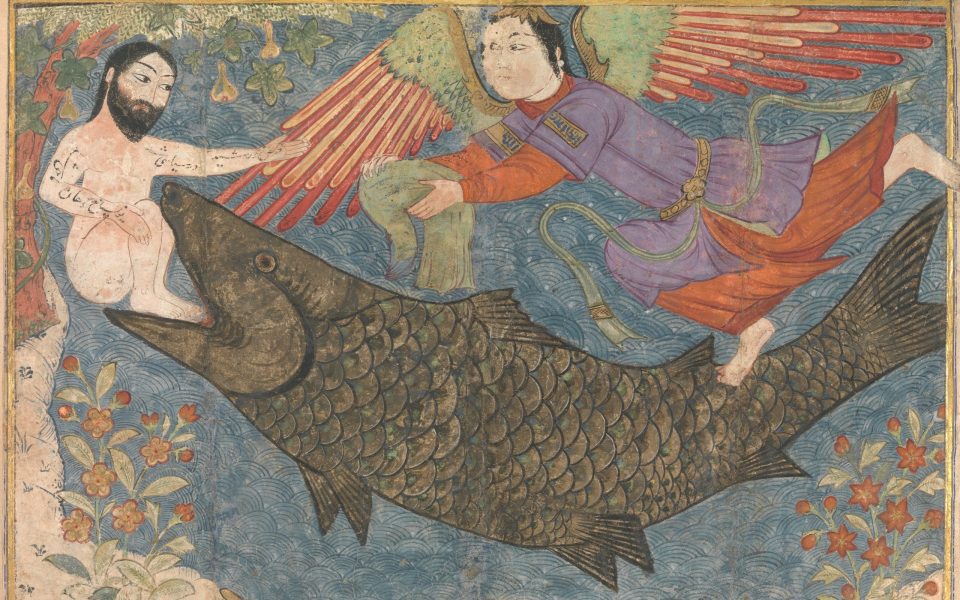 • I’m getting my public-domain images from the Metropolitan Museum of Art in New York City these days. We just call it “the Met.” Tonight we’ve got “Jonah and the Whale” — the version from the Quran — a painting on paper from about 1400.