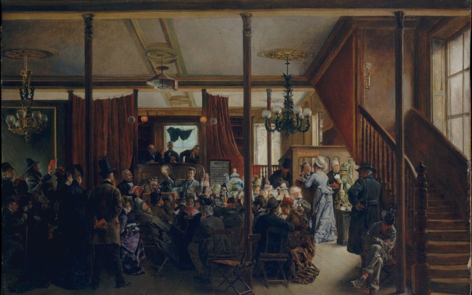 - “Auction Sale in Clinton Hall, New York, 1876” by Ignacio de León y Escosura is an exquisite example of subtext and composition. Thanks to the Metropolitan Museum of Art’s public-domain collection.