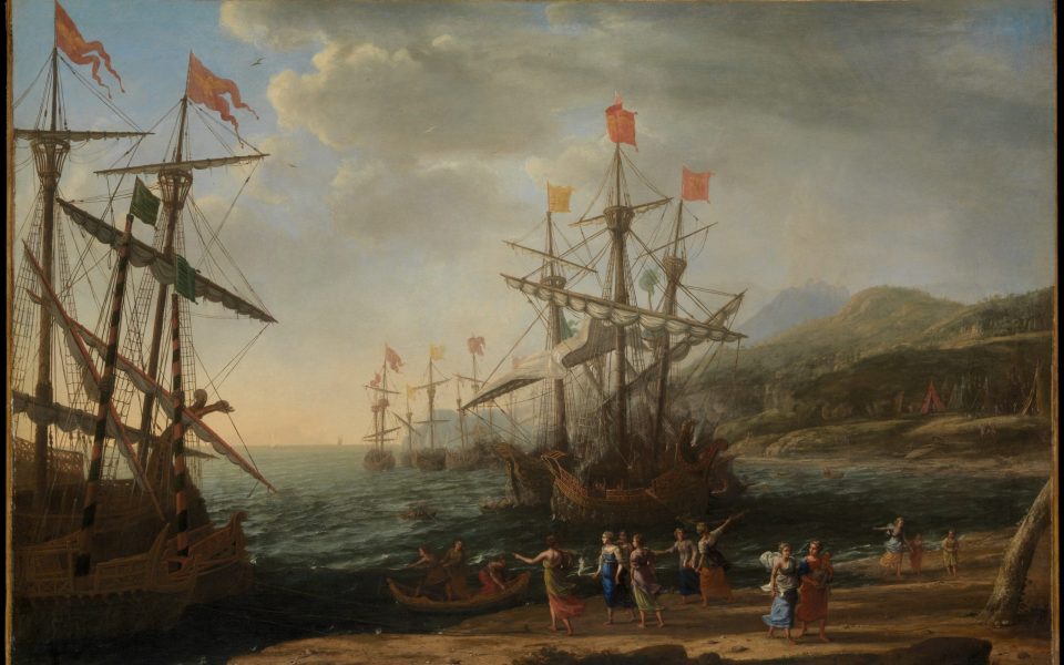 - I’m getting my public-domain images from the Metropolitan Museum of Art in New York City these days. We just call it “the Met.” Tonight we’ve got “The Trojan Women Setting Fire to Their Fleet,” by Claude Lorrain, ca 1643.