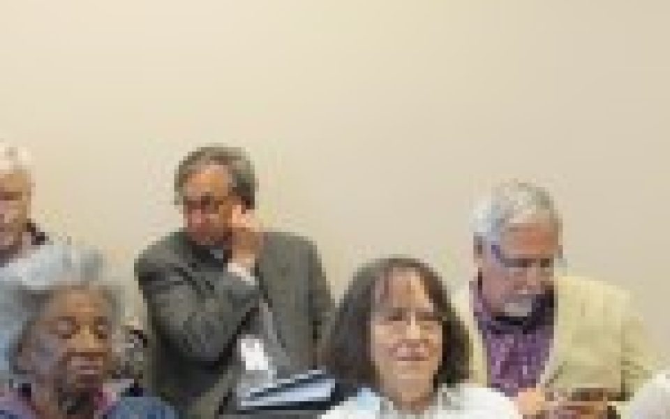 Carolyn Highsmith (front row, center) watches the Forsyth County Board of Elections count absentee ballots, along with opponent John Larson (back row, center).
