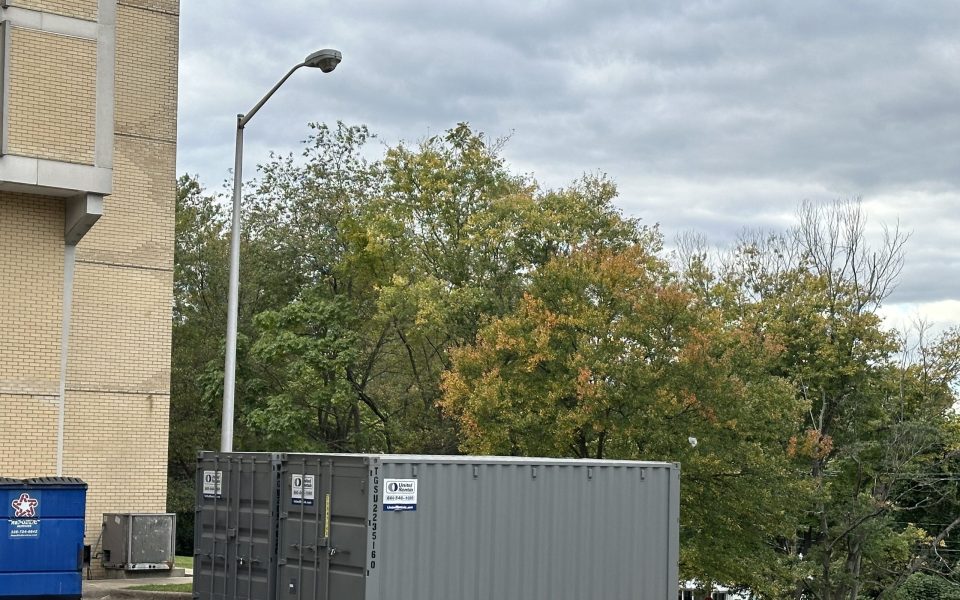 Pieces of the new elevator are in a box outside the building, awaiting assembly.