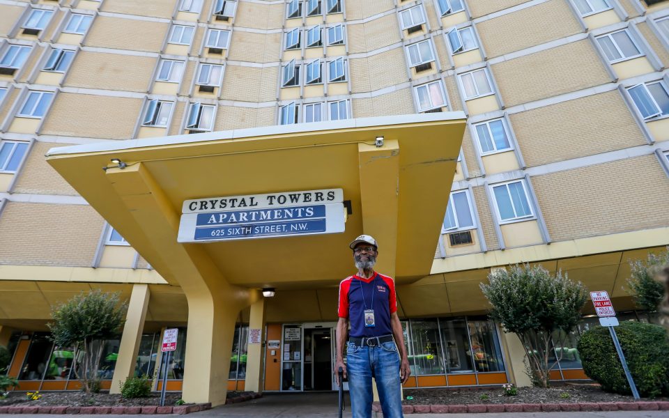 Featured photo: Crystal Towers resident Samuel Grier stands in front of the building (photo by Jerry Cooper)