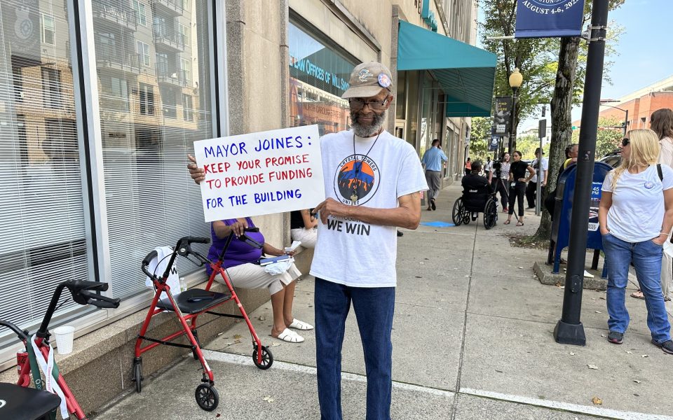 Featured photo: Crystal Towers resident Samuel Grier holds up a poster during a protest outside of the HAWS offices on Sept. 12. (photo by Gale Melcher)