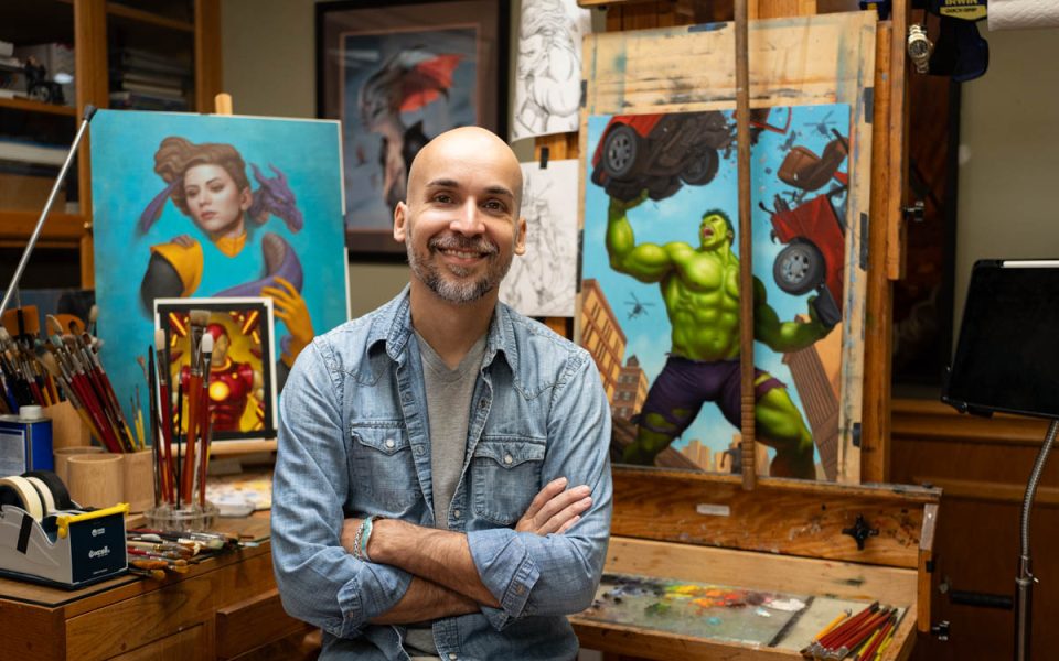 Greensboro artist Dan Dos Santos painted 137 original works for the official 2022 Marvel Masterpieces set (photo by Carolyn de Berry)