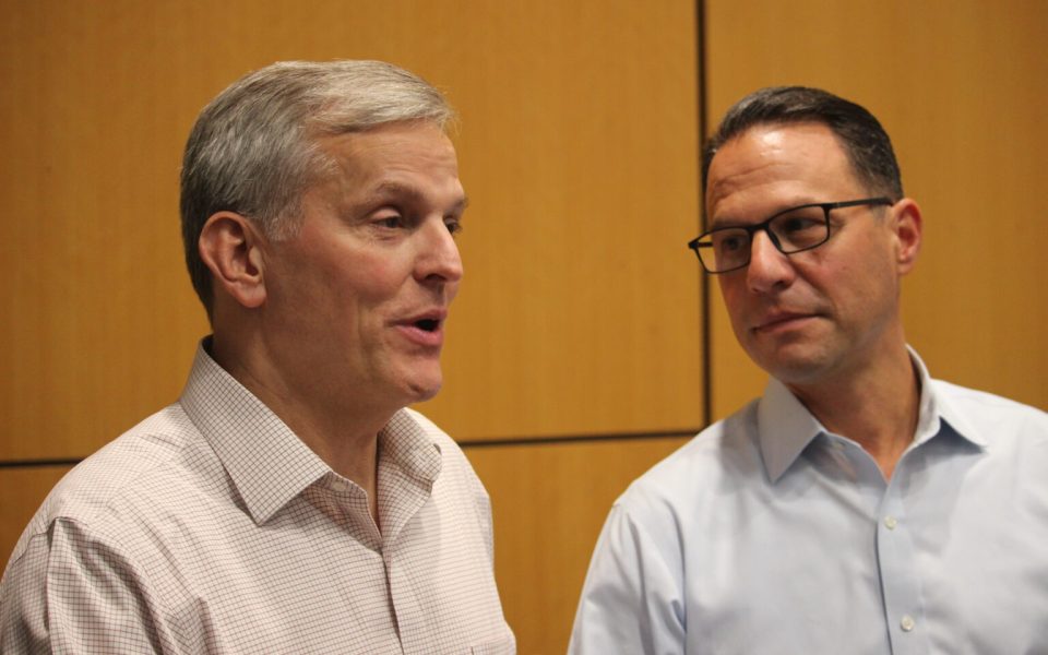 Featured photo: North Carolina Attorney General Josh Stein (left) and Pennsylvania Gov. Josh Shapiro speak to reporters at the University of North Carolina-Greensboro in Greensboro, North Carolina on Sunday, Sept. 29, 2024. (photo by Galen Bacharier/NC Newsline)