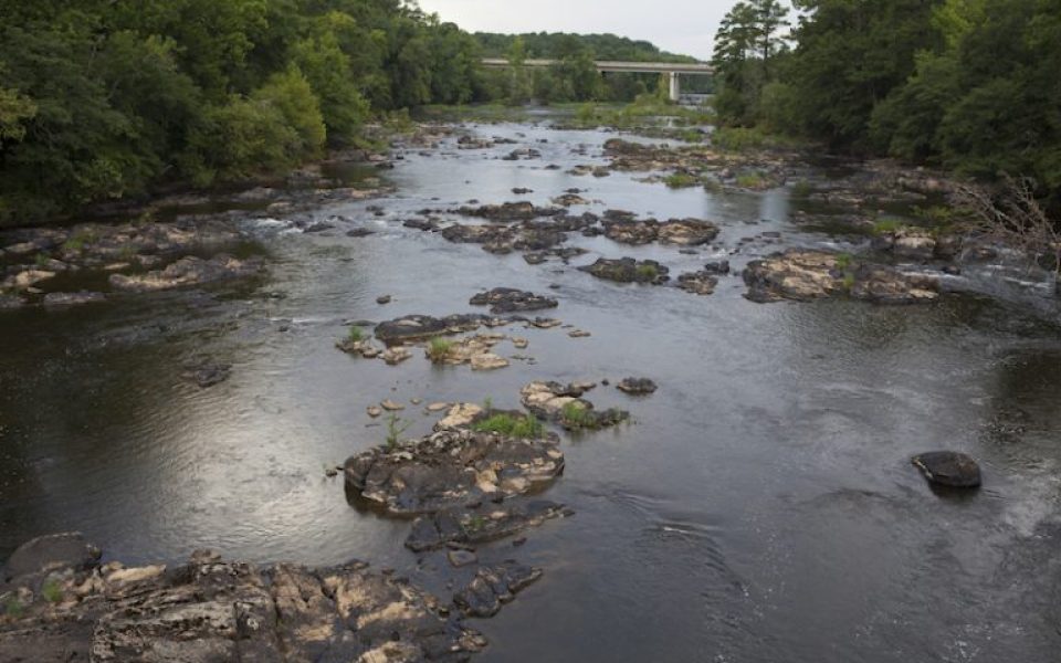 Featured photo: The Haw River, as viewed from the Bynum bridge. The river has been contaminated with 1,4-Dioxane; sources include the City of Greensboro, which is upstream. (photo by Lisa Sorg for NC Policy Watch)