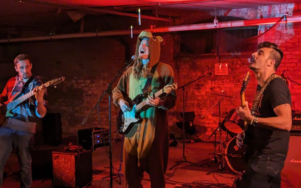 Then alt rock/metal band When We’re Sober finished out the night as members of other groups crowded the front of the stage. Grey Hyatt, wearing a bear onesie, filled the room with his deep, chanting vocal style. On guitar, Tony Luz was just showing off, playing intricate, fast ornaments between phrases, stepping into the beat like a frenzied metronome as a mosh pit began to form.