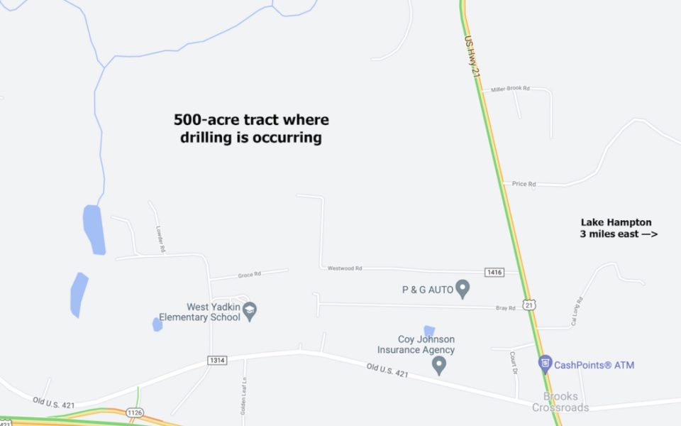 The drilling property is veined with wetlands and streams, including tributaries to Lake Hampton, which lies just three miles away. Yadkin officials have designated the 140-acre lake as a future water supply for the county.