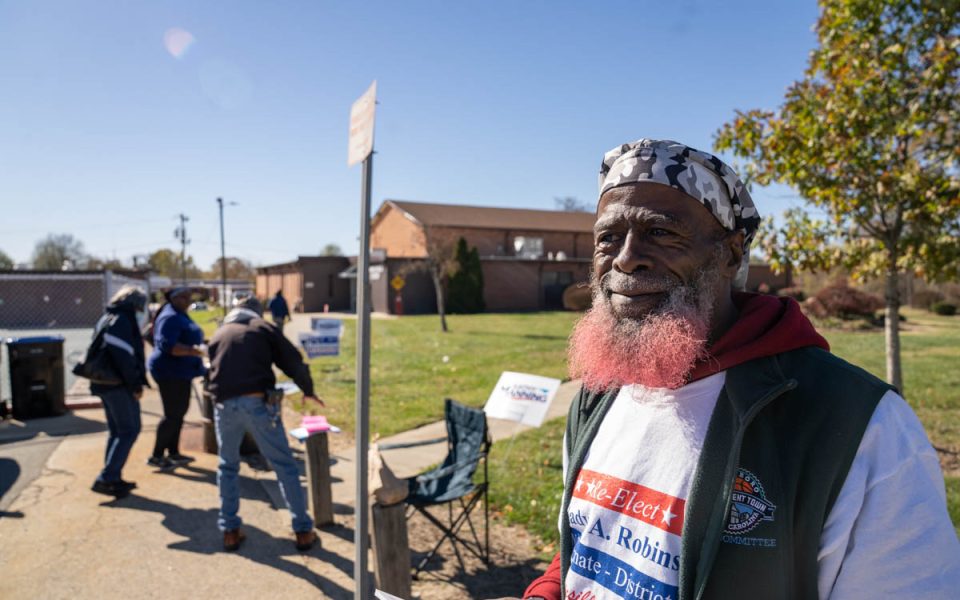 Feature Photo: Thomas Clodfelter greets voters on Election Day at Warnersville Recreation Center, Greensboro, NC. [Photo by Carolyn de Berry]