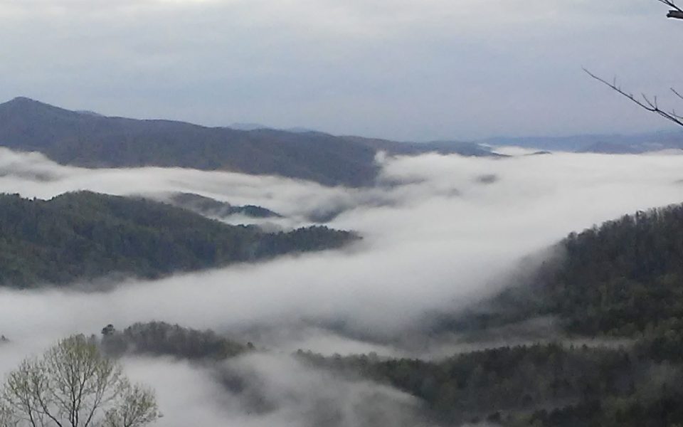 When I got up this morning and stood on the deck, I saw white clouds settled in the green valley below like a gaseous sea, islands of mountaintop rising through.