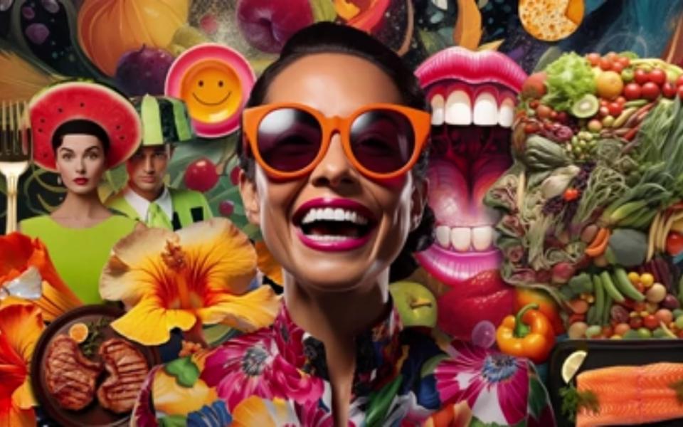 The watermelon lady pops up again, and we enter the center white lady’s sunglasses which reflect actual food served in our local restaurants.