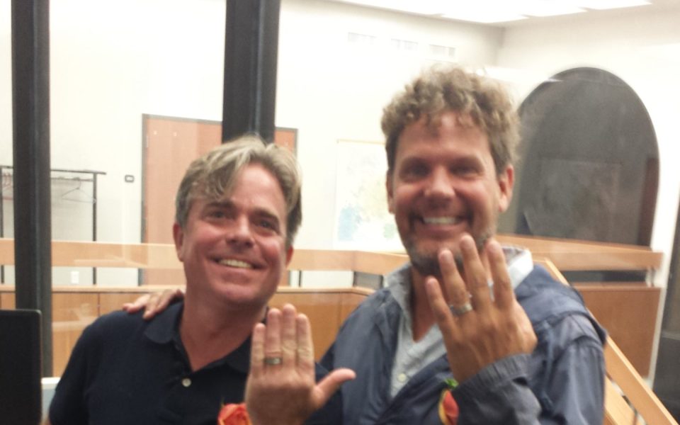 Frank Brooks grabbed Brad Newton around the waist and pulled him close. Newton’s fingers walked across his buddy’s shoulders and came to rest in a loose embrace. Together they released the tension that had built up since Monday, when the US Supreme Court declined to hear arguments in support of states’ marriage amendments, indirectly nullifying the bigotry enshrined in our own state’s constitution since 2012.