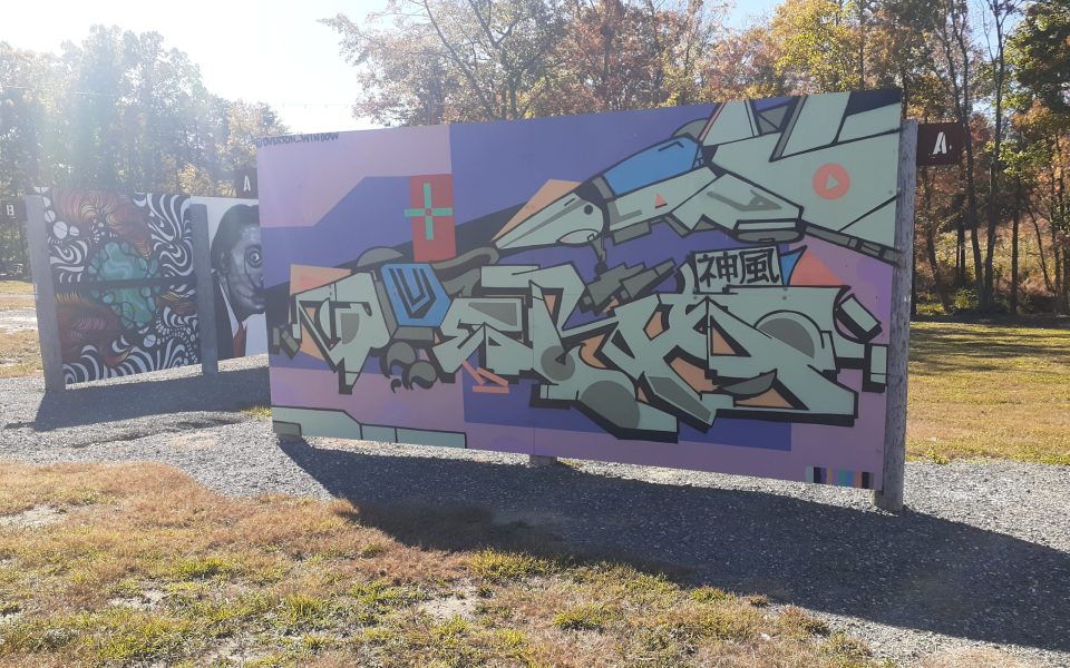 The Kotis Street Art Outdoor Gallery grows amid a twisting gravel path, on the cleared-off half of a lot by the roller rink, a couple affordable-housing complexes and a Kotis strip mall that looks like it was made from bathroom tile in 1987.