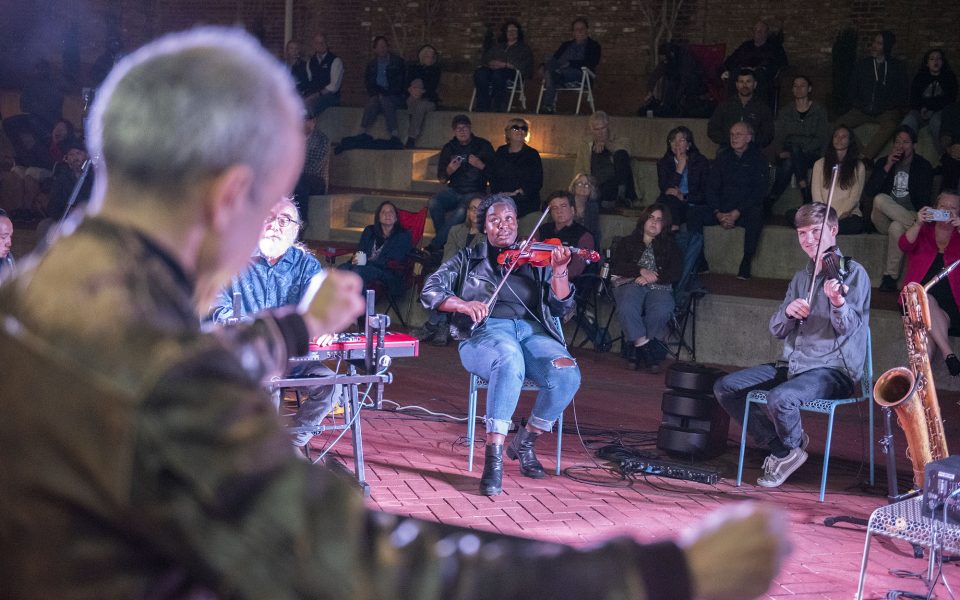 Elvis Costello said that writing about music is like “dancing about architecture,” and in this way it is impossible to describe how Previte can orchestrate a spontaneous drum battle using just his eyes and his hands, the way he can pull an extended solo from a violinist just by smiling, how he can weave a groove from an unspooled cacophony of sound.