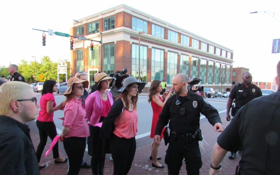 Eight people were arrested in downtown Greensboro tonight, as protesters dressed in pink sat down in Friendly Avenue near Center City Park to highlight frustration with city council’s handling of an incident of alleged police brutality at the Fun Fourth Festival last year.