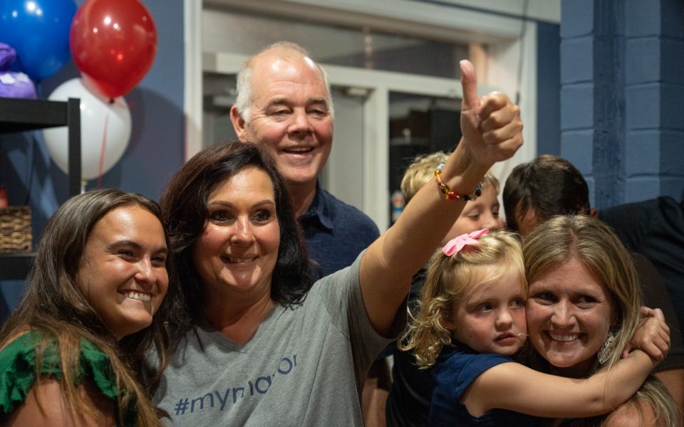 Featured photo: Nancy Vaughan celebrates on Election Night after unofficial results showed that she re-won her seat for Greensboro mayor. (photo by Carolyn de Berry)