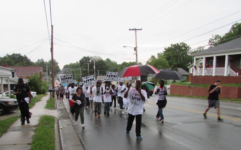 Ignoring inclement weather, about a hundred people marched against racist police violence in High Point, with both organizers and police ending on a high note.