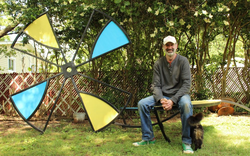 “Pretty much all of these pieces are stuff I made staying at home,” explains the sculptor as he gives a tour of his backyard. “My wife and I both teach at New Garden Friends School, and we both transitioned over to remote learning, so I do remote learning ’til noon, and then I build sculpture in the afternoons…. It’s really enabled me to start mass-producing some pieces.”