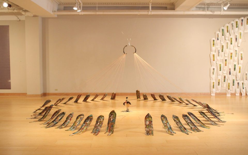 Rather than awaiting use on a physician’s tray of disconcerting implements, crude obstetric forceps collect the ends of numerous strings at the peak of the conical, mixed-media installation. The strings hold up the tips of brightly printed bandage gauze, with layers of images from Jan-Ru Wan’s upbringing in Taiwan that she wove into the shape of houses, each holding a ceramic spoon in the center. The arrangement stops the beholder in their tracks, and that’s no mistake.
