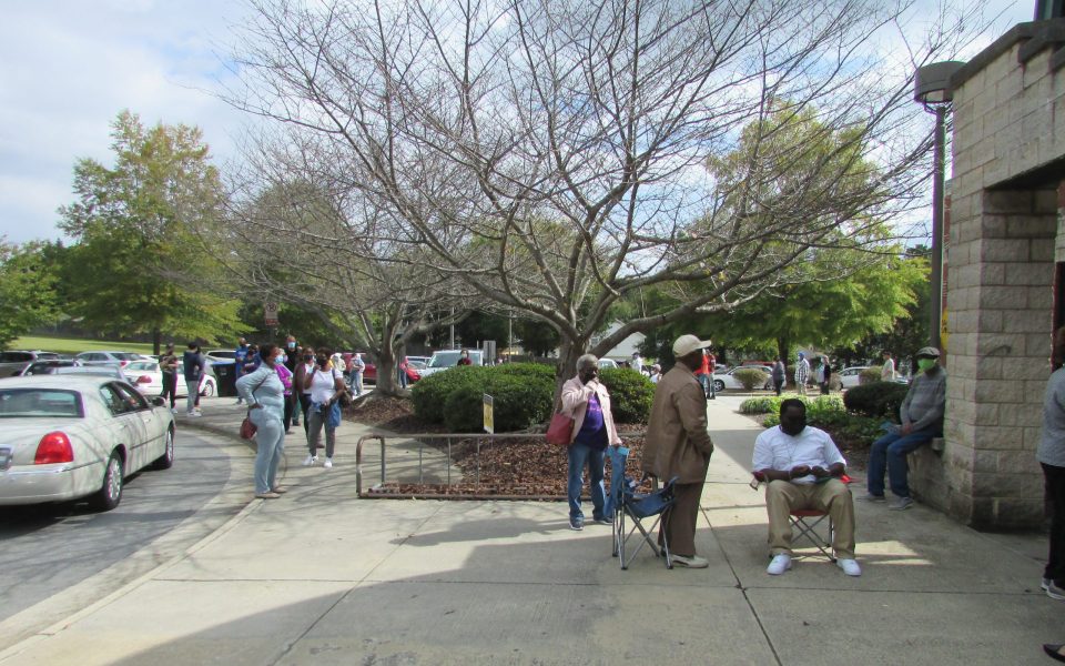 Voters wait in line at the Brown Recreation Center polling place in Greensboro on the first day of early voting. (photo by Jordan Green)