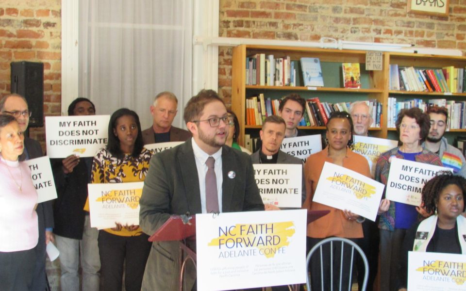 On the eve of oral arguments before the US Supreme Court, a coalition of faith leaders, civil libertarians and business owners gathered at Scuppernong Books in Greensboro on Monday to make the case that private businesses don’t have the right to discriminate against people on the basis of sexual orientation.