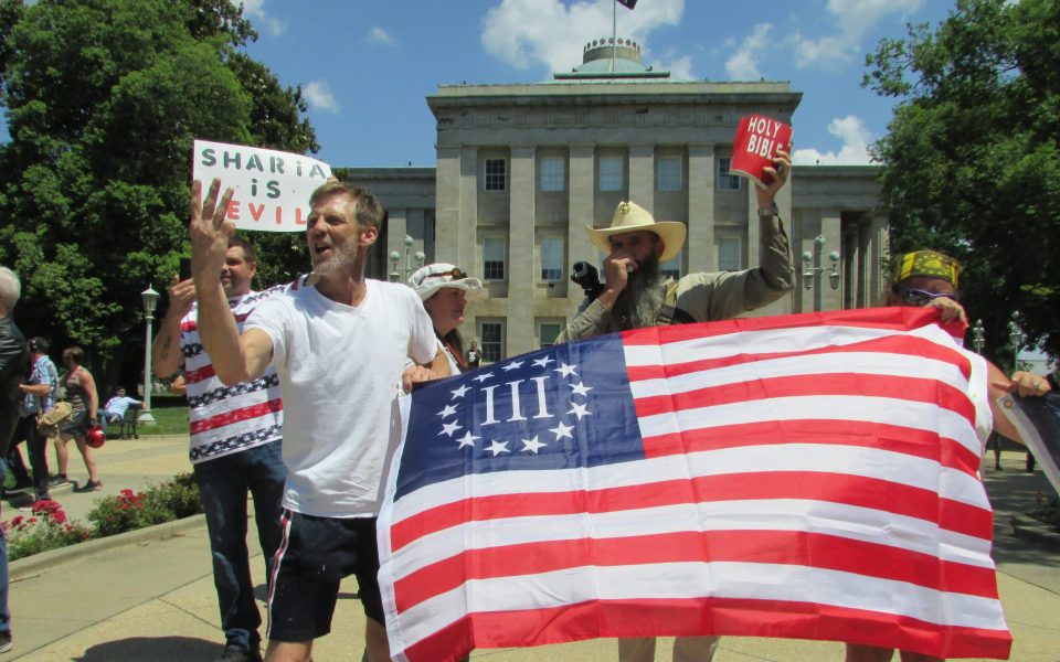 Far-right groups converged on the grounds of the State Capitol in Raleigh for an anti-sharia law rally, part of a nationwide string of events hosted by the anti-Muslim organization ACT for America, on Saturday.