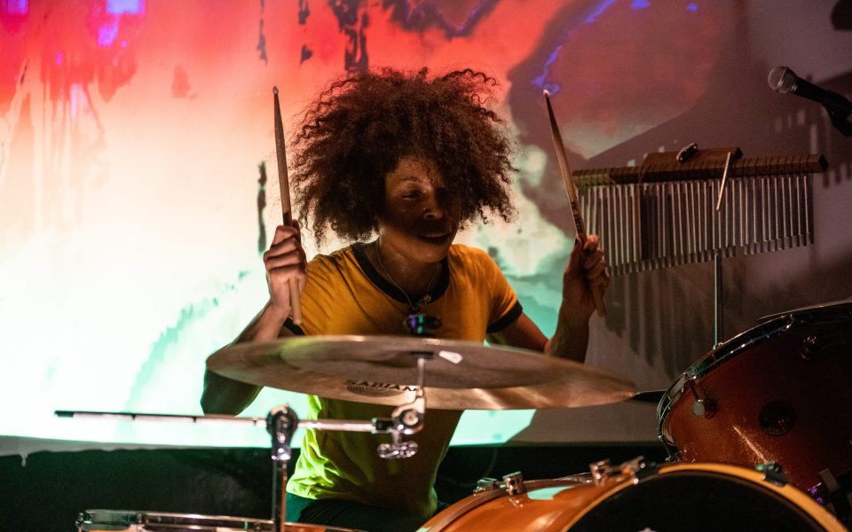 Sarah Wilson, drummer of CHEW, drives the conversation with her drumkit, commanding the stage in front of a screen projecting trippy, dripping infrared filters over slowed-down live footage. She runs her left drumstick along a cascade of chimes while pounding the bass and tap-tap-tapping the snare. She’s in control; a song slows and quiets and it’s her above-the-head, “One, two, three, four!” that cues a rapid crescendo from her bandmates.
