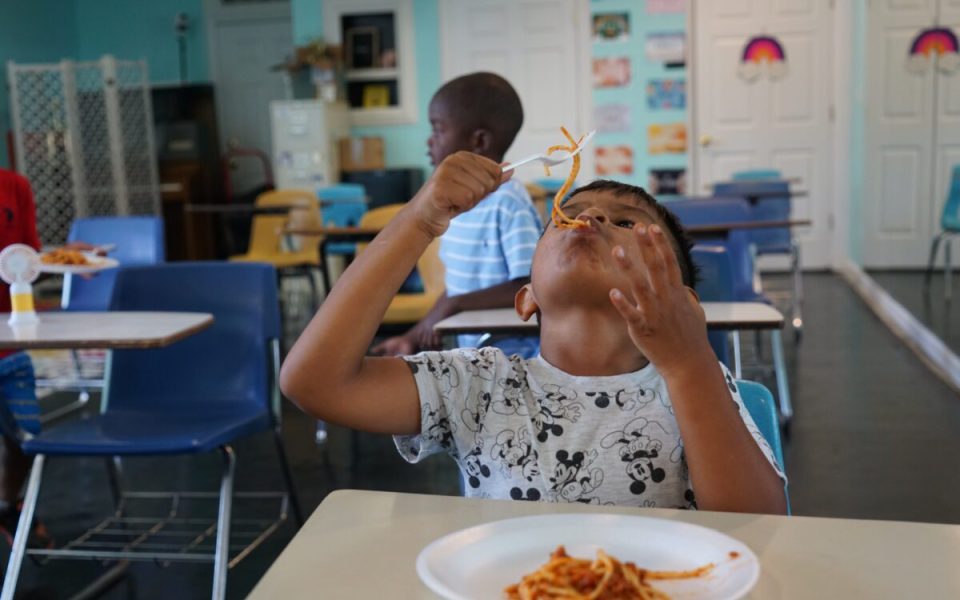 Featured photo: An elementary school student eating lunch at D-Up’s summer camp program in High Point. (photo by Alli Lindenberg/Education NC)