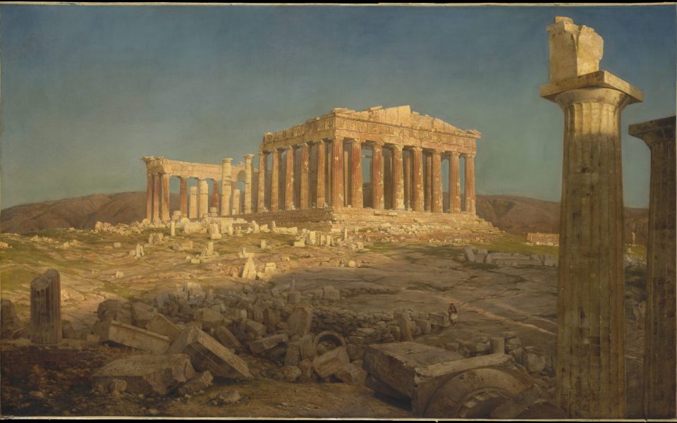 Church’s expansion into historic themes can be seen most aptly in his 1871 painting “The Parthenon,” completed a few years after his visit to Greece. Though on first glance, Church’s famous use of color and luminism catches and directs the eye to the glowing ruins caught in the waning afternoon light, there is still much more at play on the canvas measuring in at almost six feet tall. In the lower horizon of the work, we see the ancient ruins covered by shadow and time, reduced to mere rubble among the dirt. While against an expanse of blue sky, golden sunlight rests heavenly on the still-standing structure of the Parthenon’s columns, making them glow in the most sacred of ways, though the threat of shadows and dust prey at the footsteps of this once magnificent edifice. The light becomes the focus of the scene, one of Church’s signature features, as if starkly illuminating humanity’s accomplishments, while also showing its fleeting nature and the brevity of life.