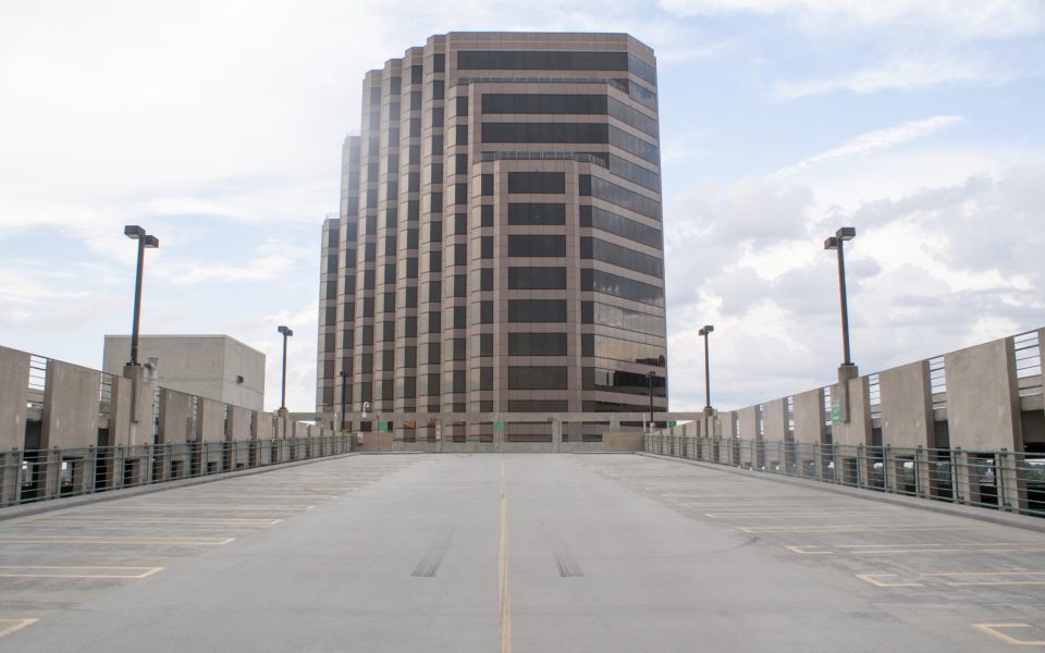 I can see the entire northeast corner of downtown Greensboro from the eighth-floor staircase of the Bellemeade Parking Deck: wisps of hanging sculpture in Lebauer Park, the Wrangler Building and its stately lawn. Like a structure in a suburban office park, the Wrangler Building wears its parking like a skirt on the surface around it. From up here, those empty parking lots dominate the view.