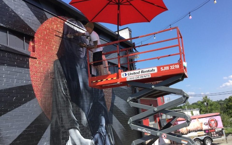 On Wednesday, the artist Jeks, aka Brian Lewis, stands atop a double-scissored man-lift and under an orange outdoor umbrella. He’s got an iPad in one hand, for reference, and he’s rattling a spray-can in the other.