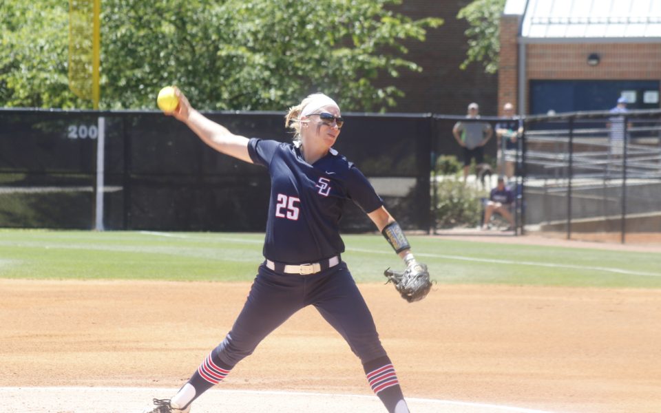 Top of the sixth. Samford University right-hander Mollie Hanson — the Southern Conference’s Pitcher of the Year — stood under the spring sun, tanned as the softball diamond. Two outs, two on, one runner in scoring position on third. Her eyes unreadable, hidden by reflective shades, the redshirt senior coughed into her fist, picked up a dash of red-clay dirt, let the excess fall away as she twirled the neon-green softball in her cupped hand. Just like every other pitch.