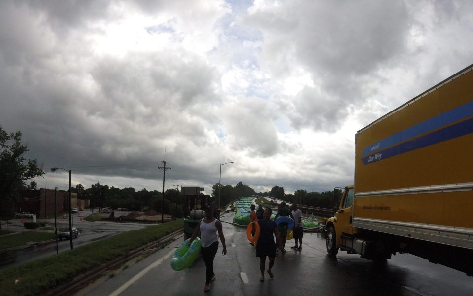 Some background: Slide the City hauls a 1,000-foot slip-and-slide to cities across the country and lets people glide down it on inner tubes. The video on the enterprise’s website features beeping EDM, food trucks, babes goofing in bikinis and numerous GoPro videos showing ecstatic grins as the camera operator shoots down the green-and-blue slide, all under brilliantly sunny skies. It seems kickass.