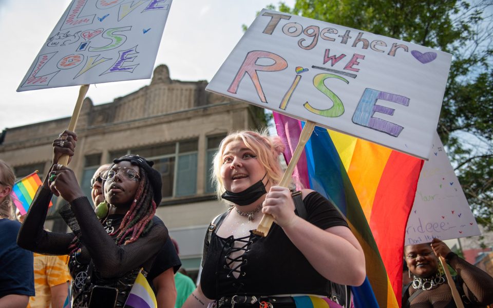 Featured photo: Taya Lindsey, left, and Jatean Starcher carry homemade signs at the Pride March To Remember in downtown Greensboro N.C., on June 28, 2022. (photo by Juliet Coen)
