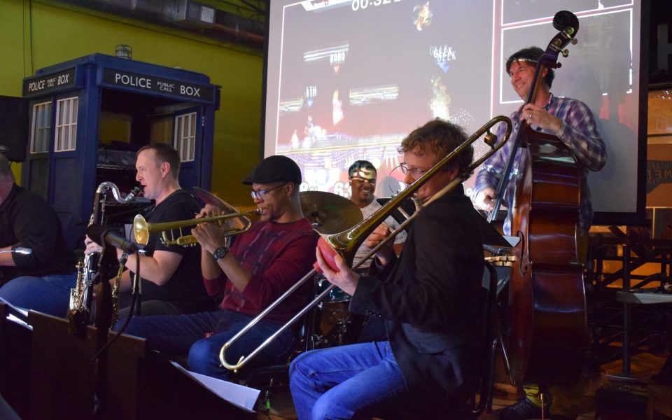 Haines couldn’t shake joy from his face as he thumbed the opening of “Cowboy Bebop”’s bombastic and playful theme, “Tank!” Eric Willie kept the tempo rolling on the bongos as action montages played between cuts from the spy film-inspired opening credits. Ultra-funky breakdowns featuring sax solos and ecstatic flurries of sound from the whole ensemble broke into a big-band finish that filled every cubic inch of the café. [pullquote]Learn more about Geeksboro at geeksboro.com and the Piedmont Triad Jazz Orchestra at ptjazzorchestra.com.[/pullquote]