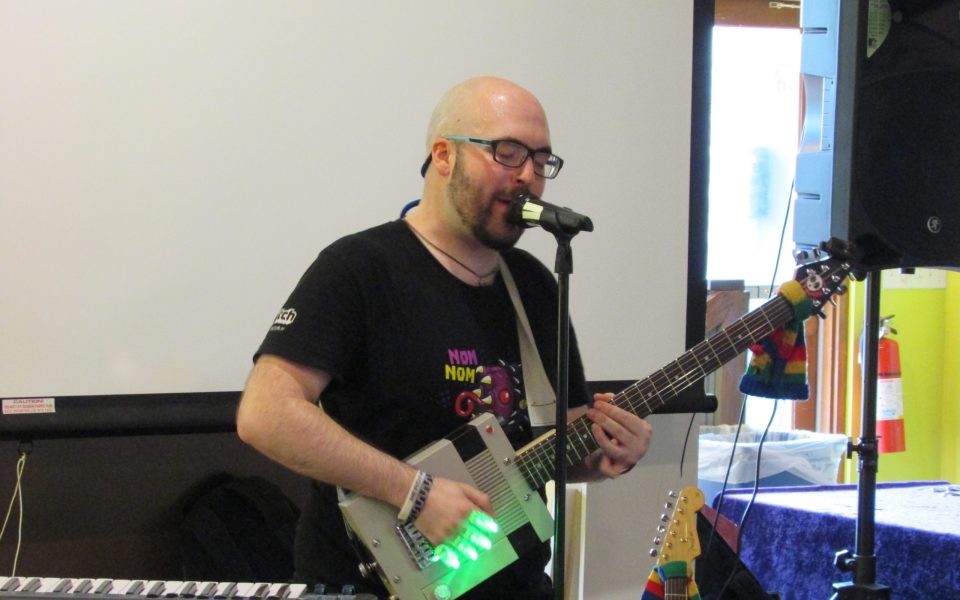 Shyguy, from Baltimore, plays original chiptunes — lo-fi electronica reminiscent of 8-bit video game music. Cooley’s style hops between electro-pop, crunchy guitar metal and R&B. He punctuates his songs, fully composed and preprogrammed from four-on-the-floor bass drum to harmonies, with power-up arpeggios on his synthesizer. Not to mention the transcendent shred-and-tap guitar on his Guitendo — a NES Paul, if you will — an original Nintendo equipped with a single humbucker near the bridge, his picking accentuated by green LED knuckles.