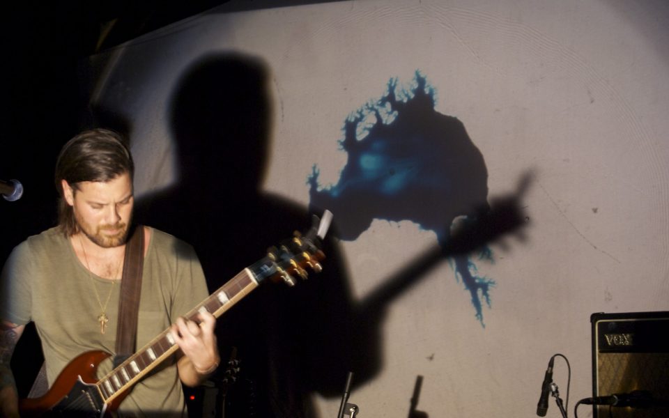 Then, as water drips onto a plate atop the overhead projector, sweeping chords and another guitar line enter the sonic fray; the orange droplets lighten to yellow and bleed outwards.