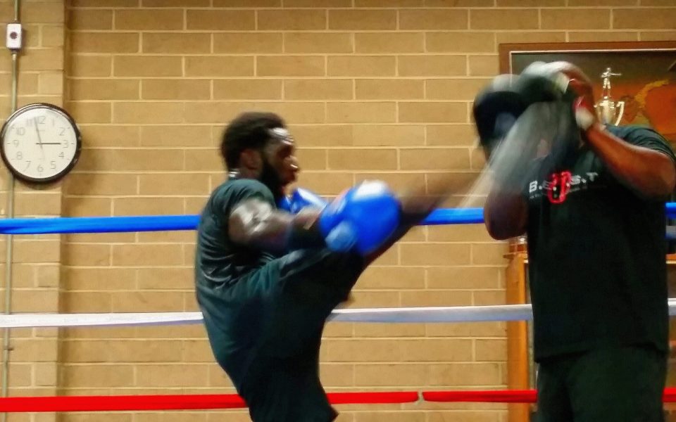 Duck, punch, kick; he lets out a hard “hah” in exertion. He hits the mitts — one, two, three, duck. One, two, three, duck. Rhythmic punches echo through the concrete chamber, then a rest, then beating and a rest. One, two, three, duck. Sweat dripped from his curly black beard onto the floor of the ring.