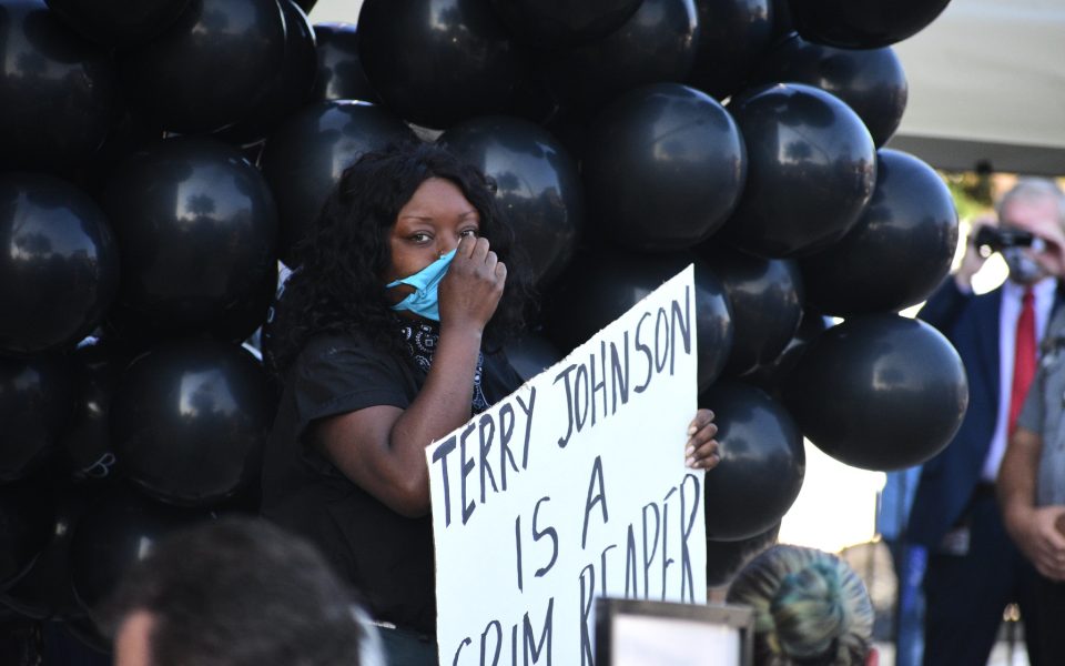 Dionne Liles at a “99 Black Balloons” protest against COVID conditions at the Alamance County jail prior to her arrest on Sept. 8. (photo by Tony Crider)