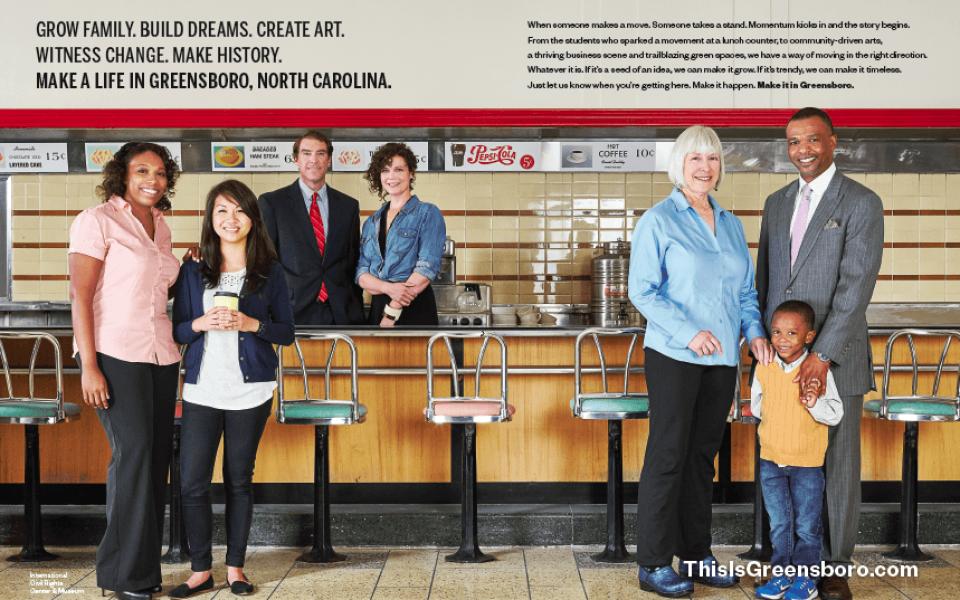 The two-page spread is set at the Woolworth’s lunch counter at the International Civil Rights Center & Museum downtown, where four NC A&T University students launched what became the sit-in movement. The ad, showing a multi-racial group of locals including musician Molly McGinn and Action Greensboro operations manager Candace Tucker, plays up that history while expanding on it.