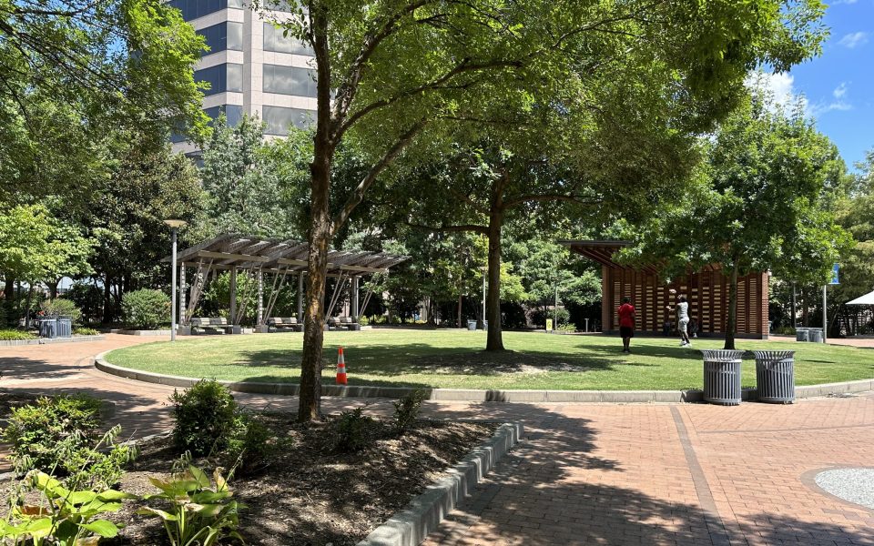 LeBauer Park is part of the city’s new Social District, but Center City Park is not. The district allows members of the public to purchase and walk with alcoholic drinks while within the boundaries. It includes areas of downtown between Gate City Boulevard and Smith Street, and appears to cut pretty strategically around Center City Park. This January, city councilmembers declined to extend the social district to Center City Park. If you purchase an alcoholic beverage from one of the bars along North Greene Street and want to enjoy it in LeBauer Park, you can’t cut through Center City Park to get there.