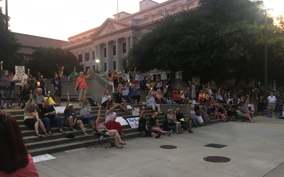 “I’ve been to Stewart Detention Center and I’ll never forget the face of a young man I met and talked with there. I asked him what he wanted me to tell people back home, he was from North Carolina and was detained— torn away from his wife and two young children,” the Rev. Julie Peoples of Greensboro’s Congregational United Church to the crowd, describing her visit to the detention facility in Georgia. “He looked over his shoulder to make sure no one was listening to him.