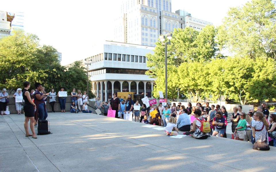Dozens of pro-choice activists gathered in downtown Greensboro on Tuesday evening. (photo by Sayaka Matsuoka)