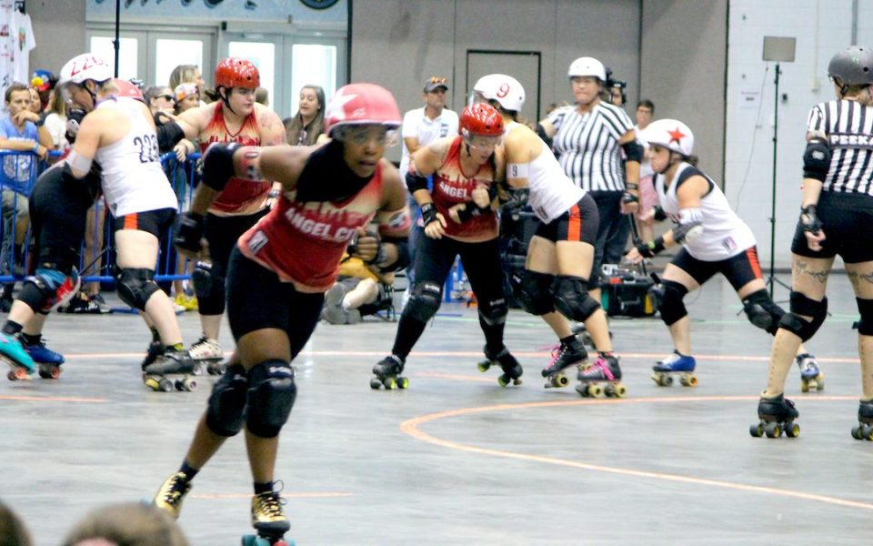 The final game unfolds setting up the Los Angeles Angel City Roller Derby against Austin’s Texas Roller Girls. The jammers struggle to pass the initial set-up from their opponents, leaning against them with full weight. The blare of the referee’s whistle cuts through the noise whenever a skate steps over the line, sending the player to the back of the formation.