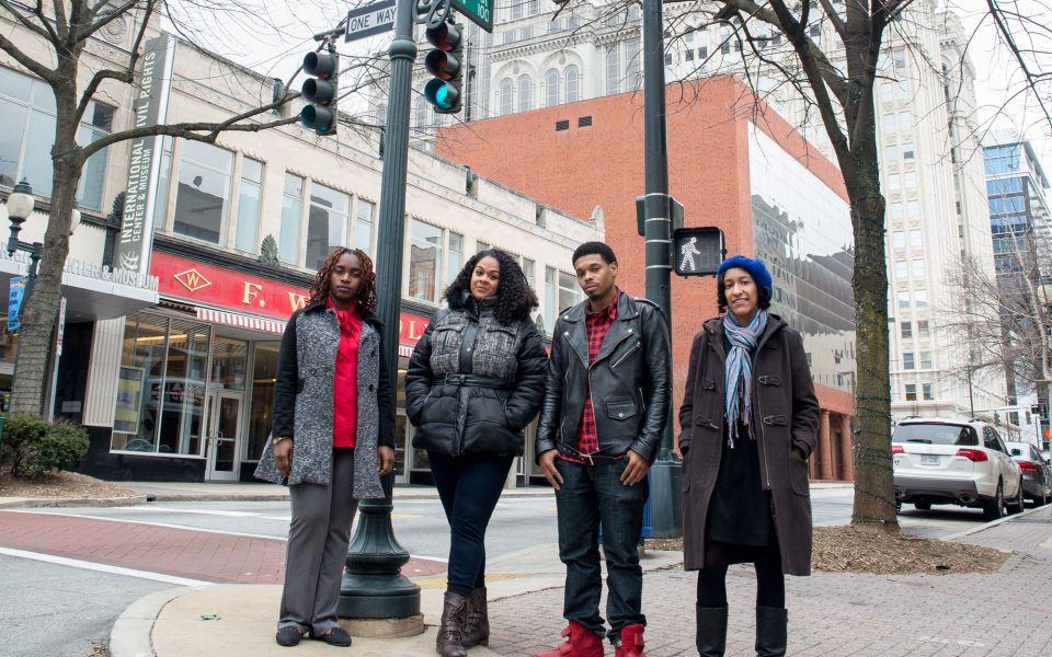 The four walk through the gift shop at the International Civil Rights Center & Museum, past souvenirs, ballcaps, 1960s Sit-In Movement T-shirts, and through a door marked “Employees Only.” It leads to a large exhibit room and the original Woolworth’s lunch counter where, 55 years ago this month, four students sat down and asked to be served.